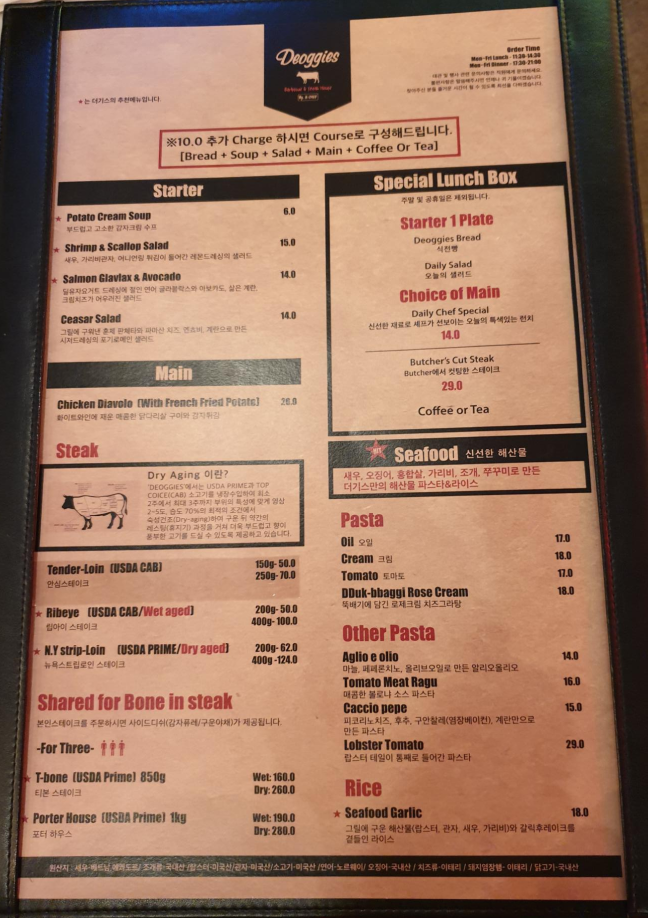 개인적으로 스테이크가 최최최최최고로 맛있는 집! 이 집을 알기 전에는 스테이크 먹고 싶으면 아웃백을 갔으나 이 집을 안 뒤로부터는 한 시간 거리지만 여기에 와서 먹는다. 그정도로 맛있고 에이징을 하는 고기라 그런지 실패를 하지 않는다. 아웃백은 지점별로 또는 날짜별로 언제는 괜찮고 언제는 냄새 나서 못 먹고 하는 등 맛이 좀 일정하지가 않아서 모험을 해야 하는데 이 집은 5번 정도 가봤지만 아직 실패한 적이 한 번도 없다.