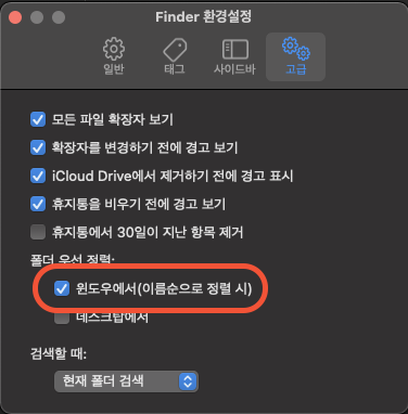 그리고 Finder 환경설정에서 고급 탭 > 폴더 우선 정렬에서 윈도우에서 체크! 하게되면