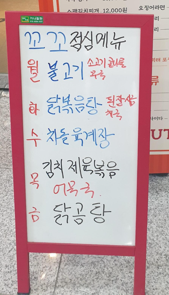 점심에 한식뷔페를 하는 포차 꼬꼬포차. 개인적으로 맘에 드는 곳이다. 회사와 가깝기도 하지만 좋은 쌀을 쓰는지 밥맛이 좋고 반찬들도 다 깔끔하고 맛있다. 가격은 7,000원! 일단 메뉴는 이렇게 정해져 있는데 언제 바뀔지는 모르겠다.