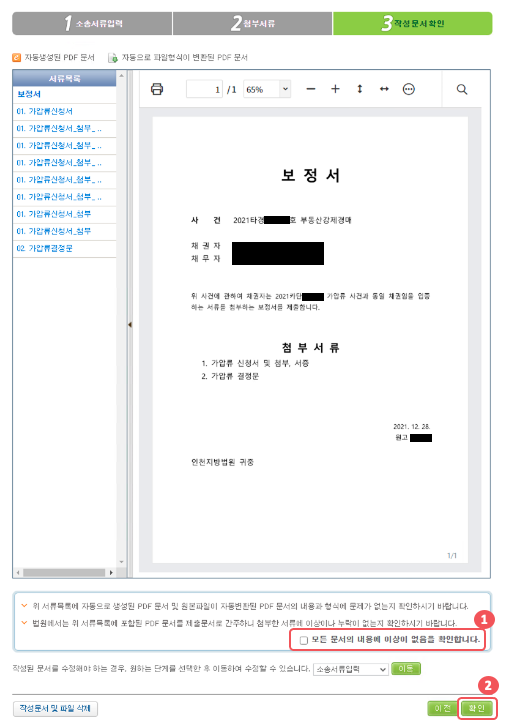 그럼 이렇게 작성했던 문서를 다시 확인할 수 있는 화면이 나오고 한 번씩 다시 검토를 했다면(검토 필수!) ❶모든 문서의 내용에~ 하는 체크박스를 체크하고 ❷확인 버튼을 클릭해서 보정서를 전송한다.