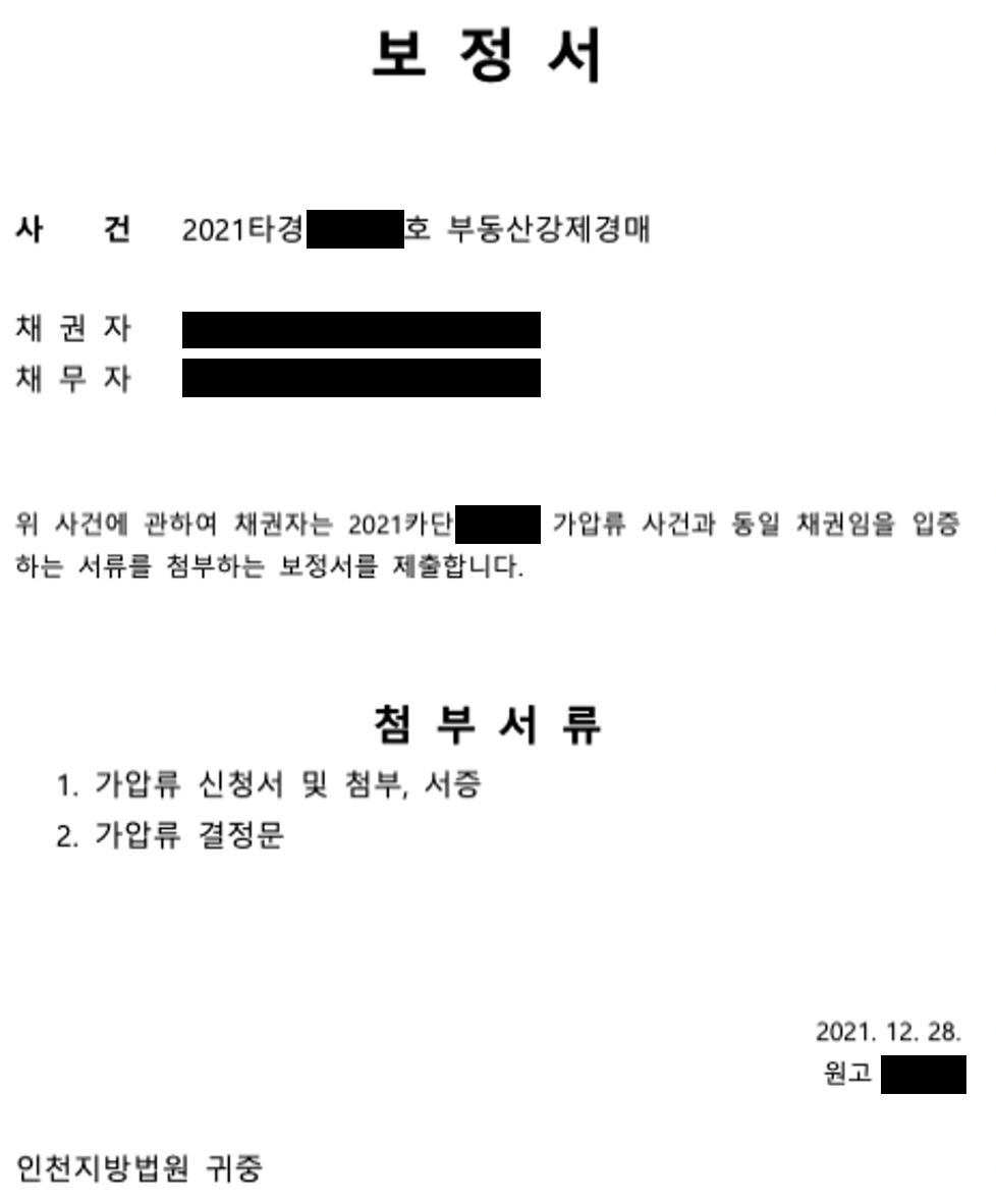 강제경매 신청서를 제출한 다음 날 이전에 했던 가압류와의 관련성을 입증하는 서류를 제출하라는 명령(?)이 전화를 통해 왔었다. 그래서 가지고 있던 서류와 함께 보정서를 간단하게 작성하여 제출했다.