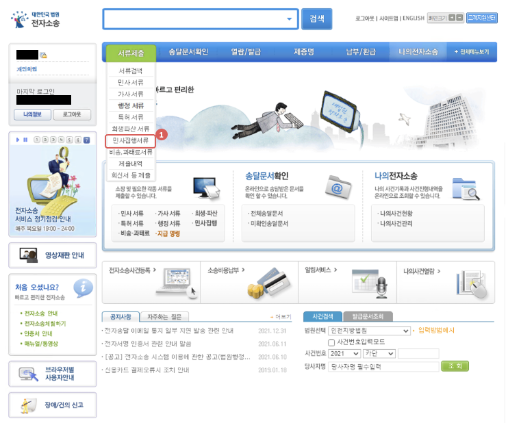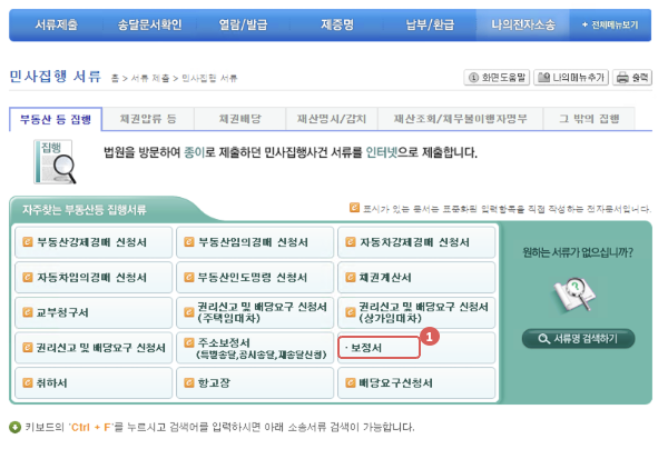 1. 서류제출 > 민사집행서류 메뉴 클릭
