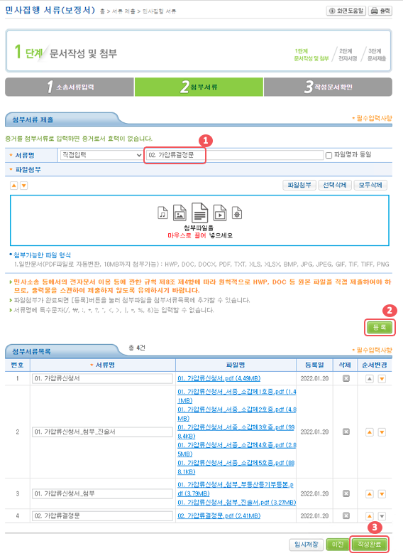 첨부서류로 가압류 신청서와 결정문을 업로드 했다. 신청서에 추가했던 서증과 첨부서류도 필요할지 몰라 그냥 다 같이 업로드 해버렸다. 나는 필요한데 안 올려서 또 보정이 나오는 것보다는 필요 없을 수도 있지만 같이 다 올려버리는 게 마음이 편해서 웬만하면 다 같이 올린다. 그리고 파일이 한 항목당 5개씩밖에 안 올라가서 가압류 신청서, 서증, 첨부, 가압류 결정문 이렇게 4가지로 나누어서 올렸다. 먼저 ❶서류명을 입력하고 해당하는 서류들을 끌어서 업로드 한 뒤에 ❷등록버튼을 눌러 파일을 등록하고 다 등록했다면 ❸작성완료 버튼을 클릭해서 넘어가면 된다.