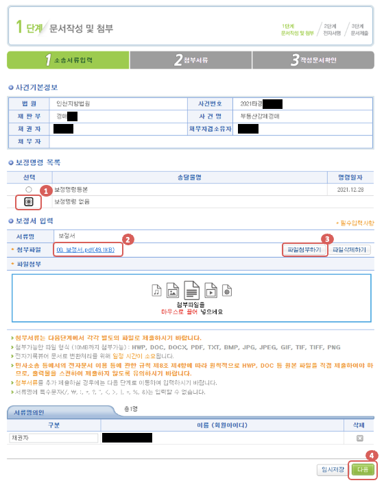4. 보정명령 선택 후 보정서 파일 첨부하기