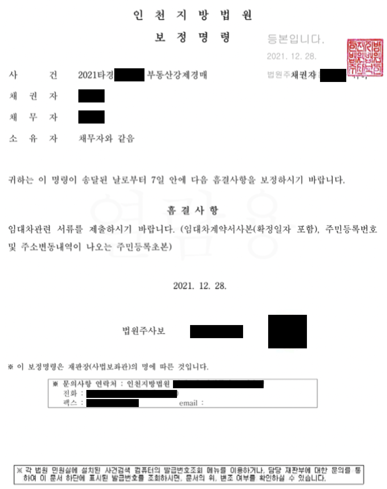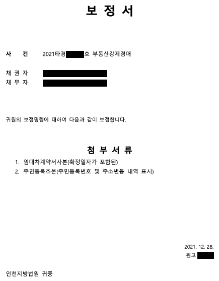 첫 번째 보정서를 보냈던 그 날 오후에 또 이런 보정명령이 내려왔었다. 부랴부랴 정부24에서 주민등록초본을 발급 받고 임대차계약서와 함께 보정서를 다시 작성해서 제출했다. 작성한 보정서는 아래와 같고 아까보다 더 간단하게 작성했다.