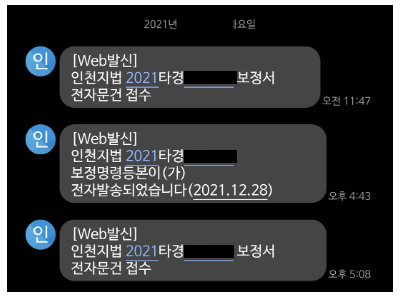하루에 처리한 보정명령과 보정서 접수 문자들.