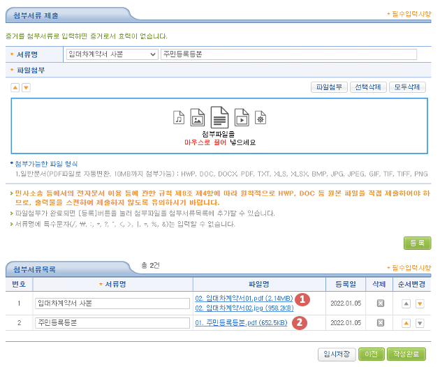 첨부서류로는 확정일자 표시가 있는 임대차계약서와 주민등록등본을 제출하면 된다. 내 경우엔 재계약도 했었어서 계약서는 하나지만 증액하고 또 받은 확정일자까지 포함하여 두 장으로 제출했다.
