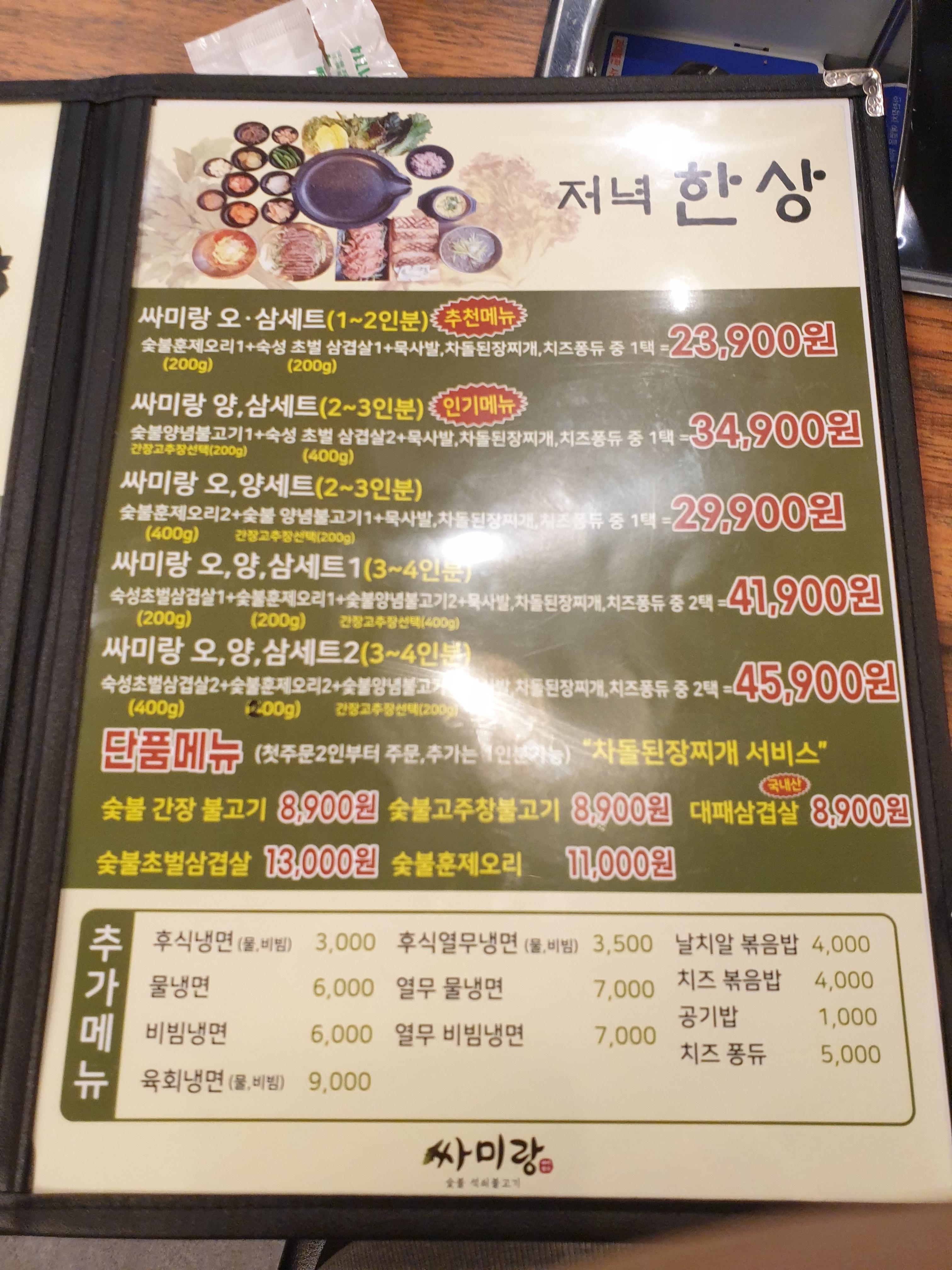 집 근처에 삼겹살 파는 곳이 생겨서 찾아가본 곳! 원래 근처에 간단하게(?) 삼겹살 먹을 수 있는 석기정이라는 곳이 있었는데 장어집으로 바뀌면서 없어져서 슬펐다ㅜ 하지만 이젠 싸미랑이 석기정을 대신해줄 것이다!